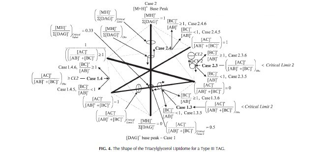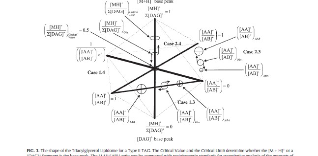 Figure 4 above represents the solution for a Type II TAG. An ABA/AAB triagylglycerol (TAG) is a fat with two chains the same and one different. The [AA]/[AB] ratio gives structural information-- a Critical Ratio.