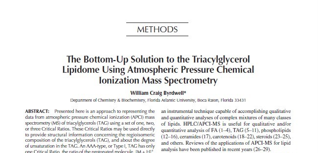 Byrdwell, W.C., "The Bottom Up Solution to the Triacylglycerol Lipidome Using Atmospheric Pressure Chemical Ionization Mass Spectrometry", Lipids, 40(4):383-417 (2005),