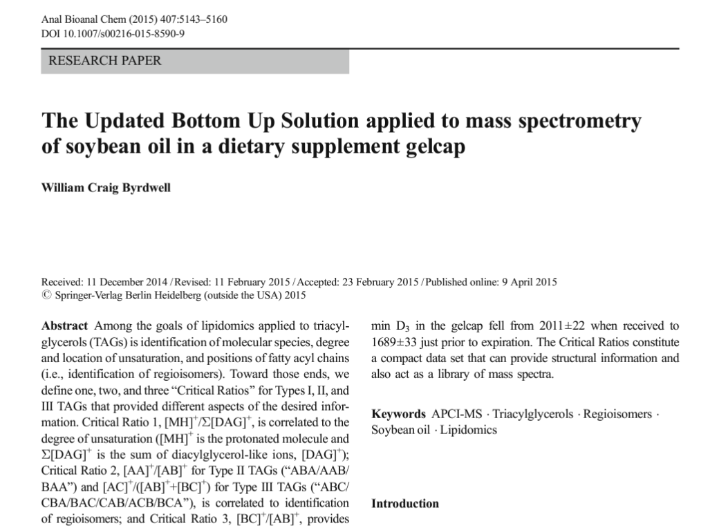 Byrdwell, W.C., " The Updated Bottom Up Solution Applied to Mass Spectrometry of Soybean Oil in a Dietary Supplement Gelcap", Analytical and Bioanalytical Chemistry, 407(17):5143-5160 (2015).