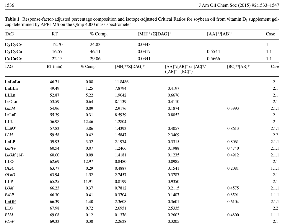 Byrdwell, W. C., "The Updated Bottom Up Solution Applied to Atmospheric Pressure Photoionization and Electrospray Ionization Mass Spectrometry", Journal of the American Oil Chemists' Society, 92(11):1533-1547 (2015), DOI: 10.1007/s11746-015-2735-z.